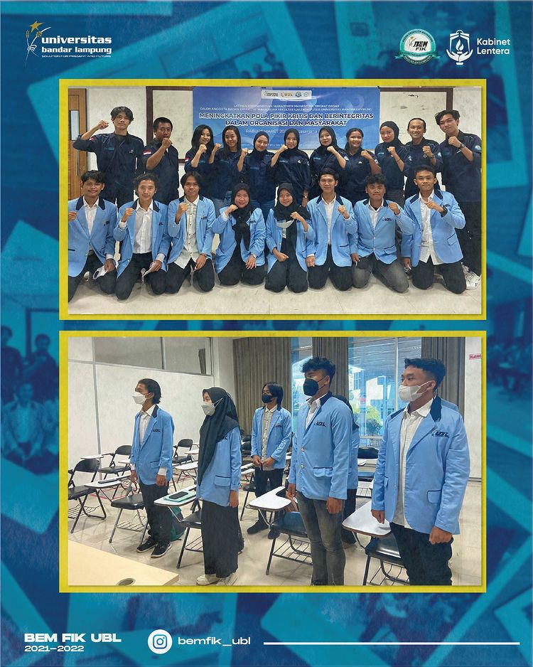 Badan Eksekutif Mahasiswa Fakultas Ilmu Komputer Universitas Bandar Lampung (BEM FIK UBL) menyelenggarakan Latihan Kepemimpinan Manajemen-Mahasiswa Tingkat Dasar (LKM-MTD) 2022 bagi calon anggota BEM FIK generasi selanjutnya.