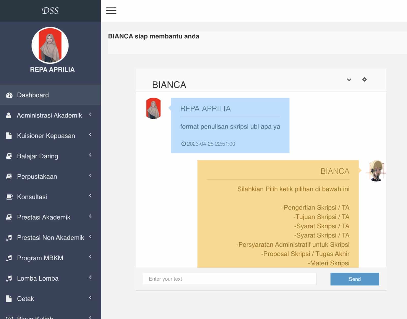Salah satu kelebihan utama BIANCA chatterbot adalah kemampuannya untuk berkomunikasi secara efisien dan cepat dengan mahasiswa. BIANCA dapat merespons pertanyaan dan permintaan mahasiswa dalam waktu singkat, yang dapat meningkatkan kepuasan mahasiswa dan efisiensi konsultasi secara keseluruhan.