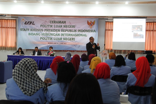 Fakultas Ilmu Sosial dan Ilmu Politik (FISIP) Universitas Bandar Lampung (UBL) sharing bersama Staf Khusus Presiden Republik Indonesia Bidang Hubungan Internasional (SKP-HI) mengenai Politik Luar Negeri di Aula Gedung Rektorat UBL pada Kamis pagi, (30/5) kemarin. Dekan FISIP UBL, Prof. Dr. Khomsahrial Romli, M.Si., menuturkan UBL sebagai universitas swasta terbesar di Provinsi Lampung terpilih sebagai salah satu Perguruan Tinggi yang dikunjungi SKP-HI di Provinsi Lampung untuk mensosialisasikan Politik Luar Negeri. Kegiatan sharing ini bertujuan untuk memberikan wawasan kepada seluruh mahasiswa FISIP UBL khususnya mengenai Politik Luar Negeri yang mencakup mulai dari konteks, pendekatan, instrument, hingga realisasi kebijakan luar negeri. “Kesempatan kunjungan SKP-HI ini kami manfaatkan untuk sharing dan berdiskusi mengenai Politik Luar Negeri yang sedang update saat ini, selain itu juga sharing mengenai peran SKP-HI dalam menentukan kebijakan luar negeri Republik Indonesia. Diharapkan melalui sharing ini wawasan mahasiswa tentang Politik Luar Negeri dan kebijakan luar negeri menjadi lebih luas,” terang Dekan FISIP UBL. Sementara itu, Asisten SKP-HI, Dr. Santo Darmosumarto, didampingi kedua Pembantu Asisten SKP-HI yakni Sanusi Ismail dan Estu Widya Murti menyampaikan bahwa kegiatan sharing dan sosialisasi Politik Luar Negeri ini merupakan program yang diselenggarakan SKP-HI mulai tahun 2012 di seluruh Perguruan Tinggi Negeri (PTN) dan Perguruan Tinggi Swasta (PTS) yang ada di Indonesia. Dihadapan ratusan mahasiswa FISIP UBL yang berasal dari tiga Program Studi yakni Ilmu Administrasi Publik, Ilmu Adminitrasi Bisnis, dan Ilmu Komunikasi, Santo menjelaskan SKP-HI memiliki misi diantaranya memberikan layanan kepada Presiden RI dalam pelaksanaan kebijakan luar negeri, membantu menterjemahkan visi dan pemikiran Presiden RI menjadi praktek-praktek diplomasi. “Misi SKP-HI juga yakni melakukan koordinasi dan kerja sama erat dan efektif dengan instansi-instansi pemerintah lain dalam pencapaian target-target Presiden RI, memberikan informasi, analisis, dan prognosis yang akurat, bermanfaat, dan tepat waktu kepada Presiden RI mengenai isu-isu di bidang Hubungan Internasional,” papar Santo. Selain itu, SKP-HI mempromosikan Presiden RI sebagai international statesmen guna memproyeksikan citra positif Indonesia sebagai Negara terbuka dan aktif berdiplomasi dan turut meningkatkan kapasitas politik luar negeri bebas dan aktif Indonesia, meningkatkan tingkat peran, relevansi, dan pengaruh Indonesia di kawasan dan di dunia serta mempromosikan pemahaman dan dukungan dari komunitas internasional, masyarakat umum, dan para pemangku kepentingan di bidang kebijakan luar negeri. |
