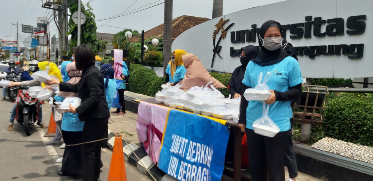 Bandar Lampung – Pandemi Covid-19 yang masih terus berlangsung berdampak tidak hanya pada masalah kesehatan akan tetapi juga sosial dan juga ekonomi, diantaranya menurunnya pendapatan sebagian besar masyarakat, bahkan harus kehilangan mata pencahariannya. Hal ini menggugah Ikatan Keluarga Besar Universitas Bandar Lampung (IKB-UBL) untuk ikut membantu meringankan beban tersebut dengan menggelar program Jumat Berkah. Program yang dinisiasi oleh Ketua IKB UBL, Desi Falena Yusuf Barusman ini di gelar pada setiap hari Jumat dengan membagikan nasi kotak dan kebutuhan pokok lainnya di beberapa titik lokasi.