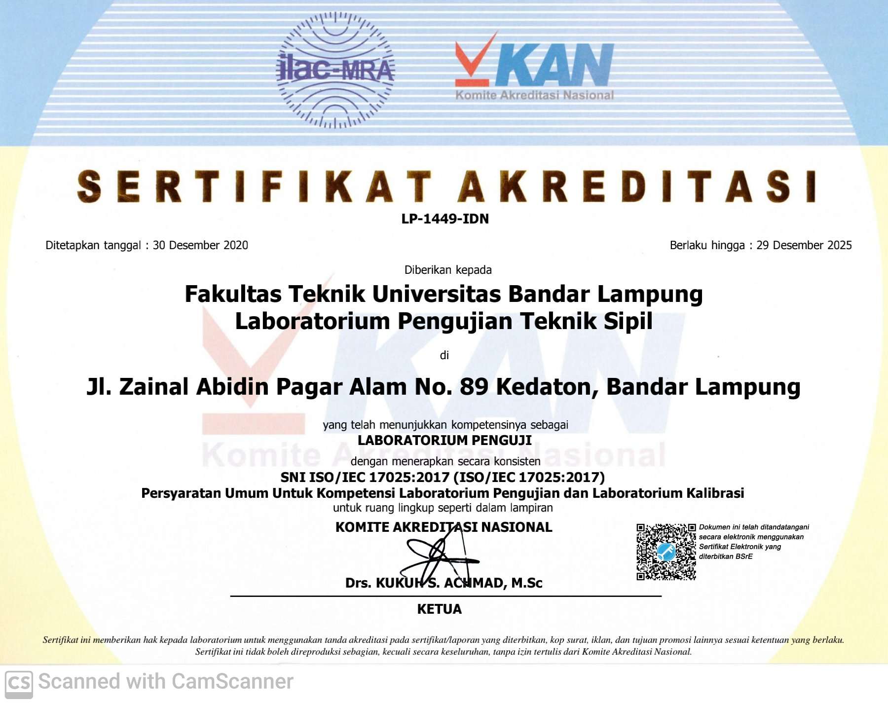 Bandar Lampung – Kabar membanggakan kembali datang dari Universitas Bandar Lampung (UBL), yakni Laboratorium Pengujian Teknik Sipil UBL (LPTS) diakreditasi dengan 15 Jenis Pengujian. Hal ini sesuai dengan Sertifikat Akreditasi yang sudah diterima oleh UBL bernomor LP-1449-IDN yang ditetapkan oleh Komite Akreditasi Nasional (KAN) pada tanggal 30 Desember 2020.