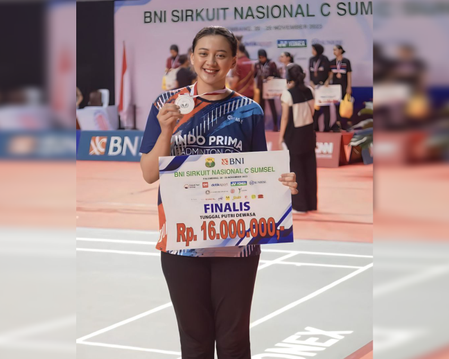 Palembang – Eprilia Mega Ayu Swastika, mahasiswi Program Studi Manajamen Universitas Bandar Lampung (UBL) berhasil menyabet Juara II nomor Tunggal Dewasa Putri Kejuaraan Bulutangkis Sirkuit Nasional BNI C Sumatera Selatan 2023 yang berlangsung di GOR Dempo, Palembang, Sabtu (25/11). Di partai final BNI Sirnas C Sumsel 2023 ini Mega harus mengakui keunggulan Ruseli Hartawan, yang merupakan unggulan pertama pada nomor ini. Meskipun belum bisa meraih Juara I, Mega mengaku banga dan senang dengan hasil ini.