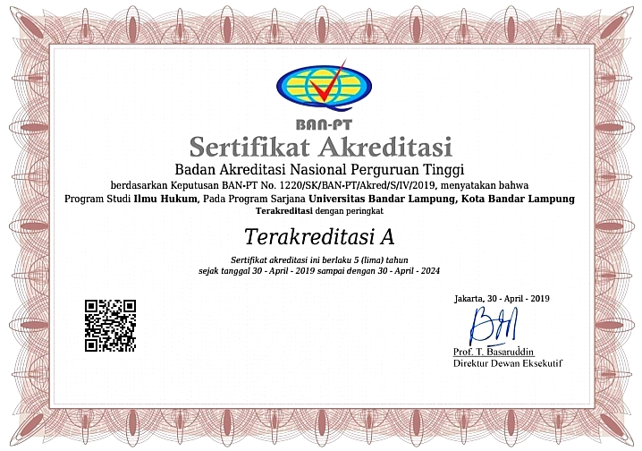 Universitas Bandar Lampung (UBL) kembali menambah satu lagi program studi (prodi) yang berhasil meraih peringkat akreditasi A (Unggul) setelah mendapatkan sertifikat akreditasi berdasarkan keputusan Badan Akreditasi Nasional Perguruan Tinggi (BAN-PT) No. 1220/SK/BAN-PT/Akred/S/IV/2019 tertanggal 30 April 2019 yang ditandatangani oleh Direktur Dewan Eksekutif BAN-PT Prof. T. Basaruddin.