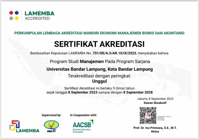 Bandar Lampung – Universitas Bandar Lampung kembali menambah program studi (prodi) terakreditasi UNGGUL yaitu prodi Manajemen program Sarjana (S1) setelah mendapatkan penetapan Surat Keputusan dari Lembaga Akreditasi Mandiri Ekonomi Manajemen Bisnis dan Akuntansi (LAMEMBA) Nomor 701/DE/A.5/AR.10/IX/2023 yang ditetapkan di Jakarta dan mulai berlaku pada 08 September 2023 hingga 08 September 2028. Penetapan akreditasi UNGGUL prodi Manajemen ini menyusul prodi Teknik Sipil UBL yang sebelumnya juga mendapatkan akreditasi yang sama. Selain itu prodi Manajemen S1 dan S2 (Magister Manajemen) UBL juga sudah mendapatkan akreditasi internasional dari Higher Education Evaluation and Accreditation Council of Taiwan (HEEACT), sebuah lembaga akreditasi internasional terkemuka asal Taiwan.