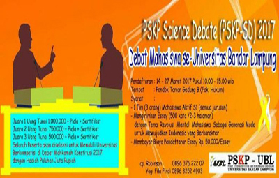 Kesuksesan dalam menghasilkan generasi-generasi yang ahli di bidang debat ilmiah tingkat nasional, seperti Ulfatun Hasanah,Wempi Andreas Lukito Hutajulu dan Robinson, yang berhasil merengkuh kategori runner up di Pesta Ilmiah Nasional Universitas Sumatera Utara (PIN USU) di Medan, 2016 lalu. Kali ini, Pusat Studi Konstitusi dan Perundang-undangan Universitas Bandar Lampung (PSKP UBL) bakal menyelenggarakan lomba debat mahasiswa-science debate (LDM-SD) se-UBL 2017, dengan tema Revolusi Mental Mahasiswa sebagai Generasi Muda untuk Mewujudkan Indonesia yang Berkarakter.