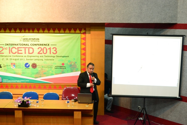 Konferensi Internasional tentang Rekayasa dan Pengembangan Teknonolgi (Second International Conference on Engineering and Technology Development – Second ICETD 2013) Universitas Bandar Lampung (UBL) yang berlangsung mulai 27 – 29 Agustus 2013 mendapat apresiasi yang luar biasa dari ratusan partisipan yang memadati Auditorium Pascasarjana UBL, Rabu (28/8), kemarin. Pasalnya konferensi internasional yang bertajuk tentang perkembangan teknik dan teknologi terbaru jarang dilaksanakan di Indonesia dan hal ini merupakan kesempatan emas bagi para ilmuan, akademisi dan masyarakat untuk bisa berpartisipasi dalam Second ICETD 2013. Demikian ungkap Rektor UBL, Dr. Ir. M. Yusuf Sulfarano Barusman, M.B.A. Dalam hari pertama Second ICETD 2013 yang diselenggarakan Fakultas Ilmu Komputer dan Fakultas Teknik UBL ini, sebanyak lima keynote speakers menampilkan paper diantaranya Prof. Dr. Ricardus Eko Indrajit, APTIKOM, Indonesia dengan judul Making Information Technology Work for Indonesia, the case of Levaraging resources trough Collaborative sharing in educational practices within higher learning institutions environment, dan Prof. Dr. Priyo Suprobo dari Institut Teknologi Sepuluh November, Indonesia dengan judul Infrastructure Health Monitoring System (SHM) Development, a Necessity for Maintance and Investigation. Kemudian dilanjutkan Prof. Dr. Moses L. Singgih dari Institut Teknologi Sepuluh November, Indonesia dengan judul Four Phases Quality Function Deployment (QFD) By Considering Kano Concept, Time And Manufacturing Cost. Dr. Riza Muhida dari Surya Institute, Indonesia dengan judul Development of Energy Saving Mobile Robot for Exploration dan Prof. Dr. Che Hasan Che Haron dari Universiti Kebangsaan Malaysia dengan judul Challenges in Sustainable Machining of Aerospace Materials. Sementara itu, dalam sesi paralel yang dibagi dalam empat ruangan, sebanyak 28 peneliti mempresentasikan karya penelitian bidang penemuan material bangunan berteknologi ramah lingkungan, energy terbarukan, pemanfaatan limbah, penataan kota berbasis pendidikan, quality control bidang manufaktur, penataan system transportasi perkotaan dan beberapa penelitian lainnya. Para peneliti ini berasal dari Universitas Bandar Lampung, Institut Teknologi Bandung, BPPT, Starch Technology Center (STC), Lampung, Institut Teknologi Sepuluh November, Universitas Gadjah Mada, Universitas Riau, Universitas Diponegoro, Universitas Hasanudin, King Abdul Aziz University of Saudi Arabia, Universitas Parahiyangan, Universitas Lampung, Universitas Malahayati, Lampung, dan Umitra Lampung. |