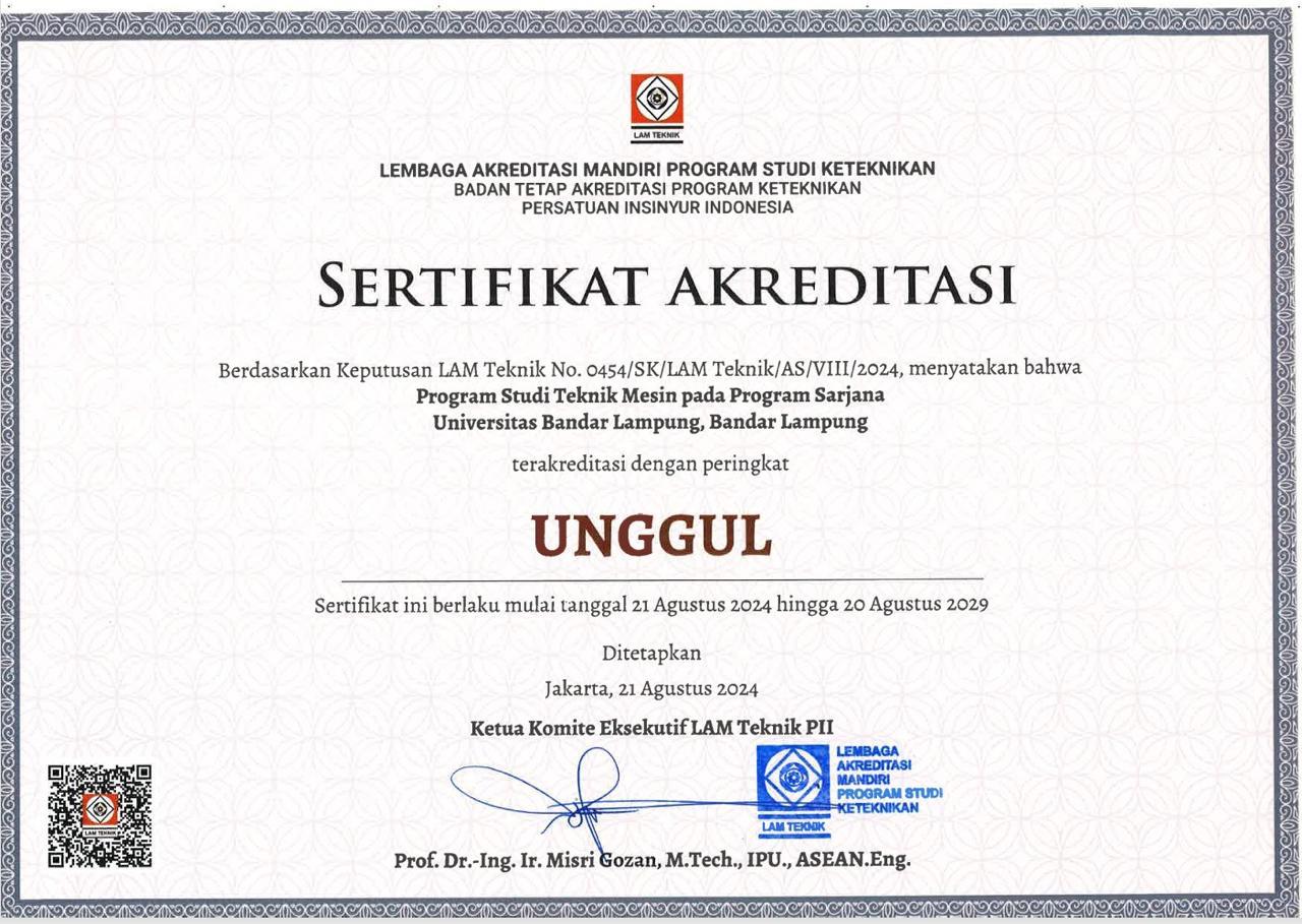 Bandar Lampung – Universitas Bandar Lampung (UBL) kembali menambah program studi (prodi) terakreditasi UNGGUL yaitu prodi Teknik Mesin program Sarjana (S1) setelah mendapatkan penetapan Surat Keputusan dari Lembaga Akreditasi Mandiri Program Studi Keteknikan, Badan Tetap Akreditasi Program Keteknikan Persatuan Insinyur Indonesia No 0454/SK/Lam Teknik/AS/VIII/2024 yang ditetapkan di Jakarta dan mulai berlaku pada 21 Agustus 2024 hingga 21 Agustus 2029.