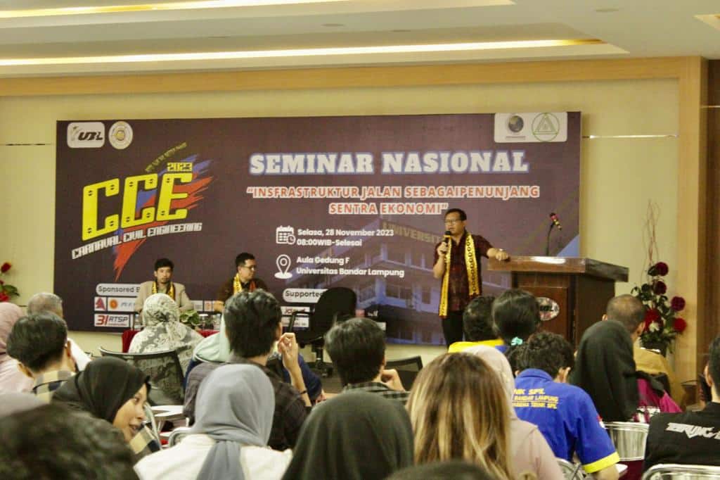 Bandar Lampung – Seminar Nasional bertema “Infrastruktur Jalan Sebagai Penunjang Sentra Ekonomi” menjadi pembuka gelaran Carnaval Civil Engineering Universitas Bandar Lampung (CCE-UBL) 2023 yang dilaksanakan selama 3 hari, Selasa sampai dengan Kamis (28-30/11). Bertempat di Aula Gedung F, Kampus A UBL, seminar nasional ini diikuti antusias oleh ratusan peserta yang terdiri dari mahasiswa, pegawai instansi pemerintah dan swasta dan umum pada Selasa (28/11). Tiga narasumber mengisi kegiatan ini, masing masing Dr. Eng. Ir. Herry Vaza, M.Eng, SC, Ahli Utama Teknik Jalan dan Jembatan, kemudian Ir. Tory Damantoro, S.T.,M.Sc, MPPM sebagai Ketua Umum Masyarakat Transportasi Indonesia dan dimoderatori Aditya Mahatidanar Hidayat, ST, M.Sc akademisi UBL.