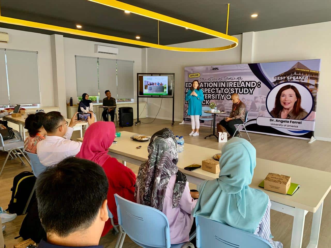 Dr. Angela Farrell dalam paparannya menjelaskan bagaimana kehidupan di Irlandia khususnya mahasiswa internasional di Universitas Limerick di berbagai fakultas dan program studi yang ada baik jenjang S2 dan S3. Dia merasa sangat senang sekali dapat bertemu langsung dengan para mahasiswa dan dosen di lingkungan UBL. Dalam pengalamannya selama membimbing para mahasiswa internasional khususnya dari Indonesia, mereka memiliki motivasi yang kuat dan bekerja keras sehingga bisa selesai tepat waktu. Tidak hanya studi lanjut ke luar negeri, Angela juga membuka peluang kerjasama penelitian, penyelenggaraan seminar internasional serta kegiatan akademik lainnya antara UBL dan Universitas Limerick. Para peserta terlihat antusias dengan memberikan pertanyaan serta diskusi usai kepada Angela seputar dukungan dari Universitas Limerick bagi mahasiswa internasional.