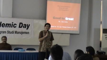 Tujuan dari diadakannya kegiatan ini adalah untuk menambah wawasan dan memperdalam ilmu pengetahuan manajemen, serta memahami materi perkuliahan yang kurang dimengerti oleh mahasiswa, yang bisa dijelaskan pada acara-acara seperti ini. Pada UBL-Academic Day prodi Manajemen ini, materi pembahasan disampaikan oleh Ketua Program Studi Manajemen Dr. Alex Tribuana Sutanto ST.,MM., dengan tema “Good To Great : Why Some Companies Make The Leap……. , And Others Don’t”