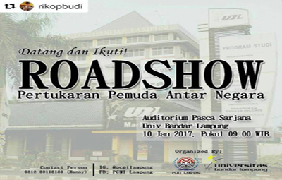 Upaya mempromosikan para pemuda Indonesia, khususnya dari Provinsi Lampung menuju dunia, Universitas Bandar Lampung (UBL) ditunjuk pemerintah sebagai tuan rumah Roadshow Pertukaran Pemuda Antar Negara (PPAN) 2017 tingkat nasional diwilayah Lampung. Kegiatan itu sendiri, terlaksana di Auditorium Gedung M, Kampus Dra. Hj. Sri Hayati Barusman, Selasa (10-1) lalu.