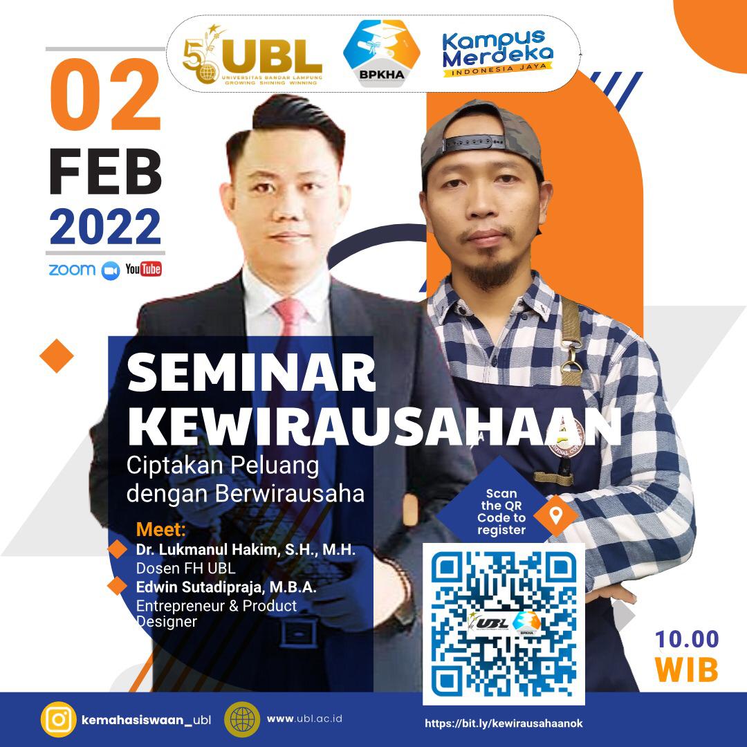 Acara ini menghadirkan dua narasumber yaitu Dr. Lukmanul Hakim, S.H., M.H. (Dosen Fakultas Hukum UBL) dan Edwin Sutadipraja, M.B.A. (Entrepreneur & Product Designer).