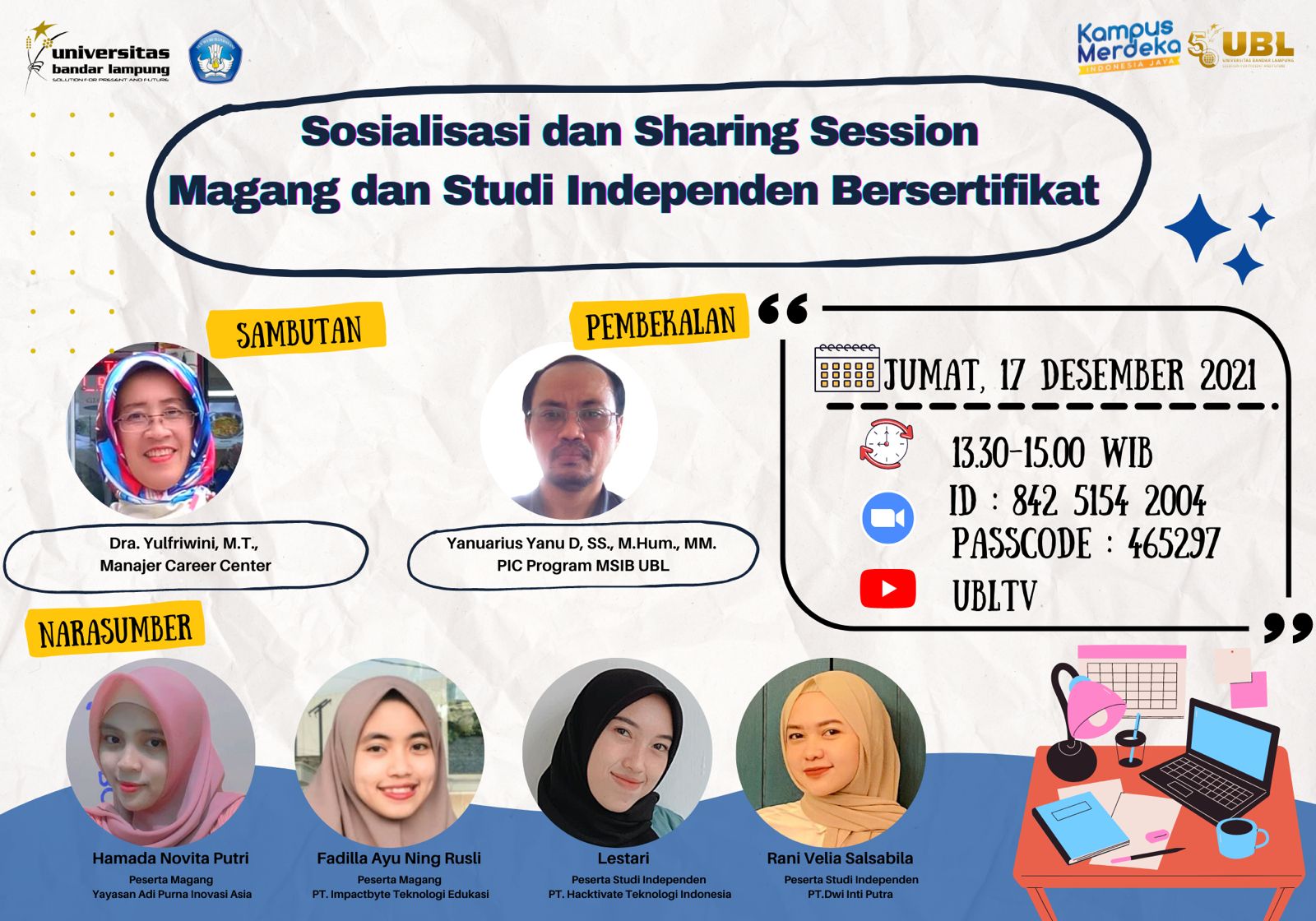 Pada hari Jumat, 17 Desember 2021, Universitas Bandar Lampung menggelar sosialisasi program magang dan studi independen bersertifikat untuk para mahasiswa seluruh program studi dan angkatan yang ada di universitas Bandar Lampung, dalam sosialisasi ini Biro Kemahasiswaan dan Hubungan Alumni sebagai penanggung jawab kegiatan, program magang dan studi independen bersertifikat juga mengundang Narasumber yang berasal dari mahasiswa Universitas Bandar Lampung. Mahasiswa yang menjadi Narasumber merupakan masiswa yang telah berhasil lolos untuk seleksi program magang dan studi independen ber sertifikat yang di adakan oleh Kemendikbud republik Indonesia pada periode lalu.