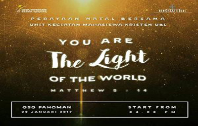 Bandar Lampung – Perayaan Natal Bersama yang diselenggarakan oleh Unit Kegiatan Mahasiswa Kristen (UKM-K) Universitas Bandar Lampung (UBL) merupakan bentuk memperdalam kerohanian, sekaligus memperingati hari natal. Perayaan akbar yang mengambil tema You Are The Light Of The World sesuai tertuang di surat Matthew 5:14 ini akan diselenggarakan di Gedung Serba Guna (GSG) Pahoman, Kota Bandar Lampung, Jumat (20-1) mendatang.